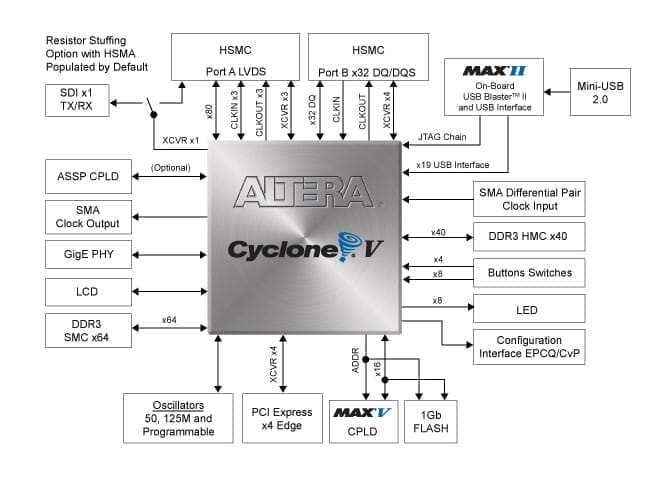 The Altera® Cyclone® V GT FPGA Development Kit can be used to prototype Cyclone V GT FPGA or Cyclone V GX FPGA applications. It offers a quick and simple way to develop low-cost and low-power FPGA system-level designs and achieve rapid results. This kit supports a myriad of functionalities such as: