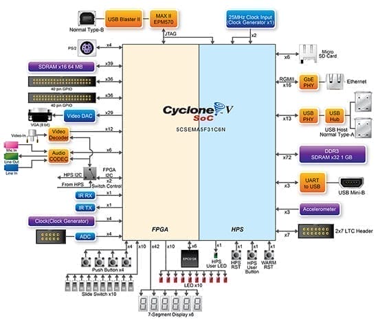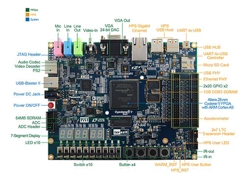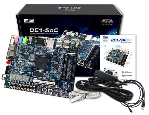 The DE1-SoC Development Kit presents a robust hardware design platform built around the Altera System-on-Chip (SoC) FPGA, which combines the latest dual-core Cortex-A9 embedded cores with industry-leading programmable logic for ultimate design flexibility. Users can now leverage the power of tremendous re-configurability paired with a high-performance, low-power processor system. Altera’s SoC integrates an ARM-based hard processor system (HPS) consisting of processor, peripherals and memory interfaces tied seamlessly with the FPGA fabric using a high-bandwidth interconnect backbone. The DE1-SoC development board includes hardware such as high-speed DDR3 memory, video and audio capabilities, Ethernet networking, and much more.