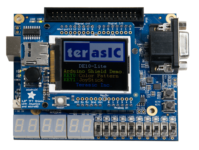 Terasic DE10-Lite is a cost-effective Altera MAX 10 based FPGA board. The board utilizes the maximum capacity MAX 10 FPGA, which has around 50K logic elements(LEs) and on-die analog-to-digital converter (ADC). It features on-board USB-Blaster, SDRAM, accelerometer, VGA output, 2x20 GPIO expansion connector, and an Arduino UNO R3 expansion connector in a compact size. The kit provides the perfect system-level prototyping solution for industrial, automotive, consumer, and many other market applications.