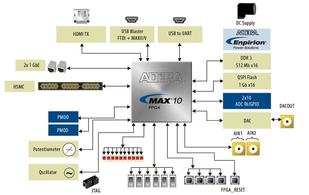 The Altera® MAX® 10 FPGA Development Kit provides a full featured design platform built around a 50 K logic elements (LEs) MAX 10 FPGA, optimized for system level integration with on-die analog-to-digital converter (ADC), dual-configuration flash, and DDR3 memory interface support. The board features on-board USB-BlasterTM II, high-speed mezannine card (HSMC), and Pmod™ Compatible expansion cards, high-definition multimedia interface (HDMI) output, and dual Ethernet for industrial Ethernet applications. The MAX 10 FPGA Development Kit provides the perfect system-level prototyping solution for industrial, automotive, consumer, and many other market applications.