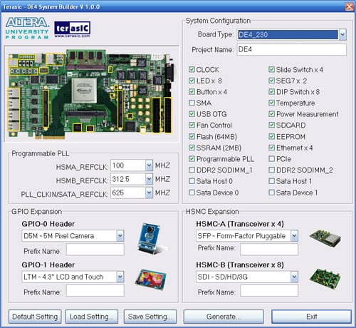 DE4 System Builder —— 專門為 DE4 開發(fā)板所設(shè)計的一套強大軟件工具。這套工具可以幫助使用者輕松建立符合 DE4 開發(fā)板的 Quartus II 項目。使用者只須專注于自己的邏輯設(shè)計,DE4 System Builder 即會直接以 DE4 開發(fā)板產(chǎn)生相應(yīng)的 top-level design file、pin assignment 以及 I/O standard 設(shè)定。除此之外,通過 DE4 System Builder 的 HSMC connectors ,你還可以選擇各種與 DE4 搭配使用的子板。