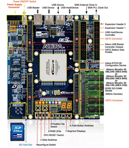 Altera DE3 開發(fā)教學(xué)板擁有世界上容量最大、效能最好的FPGA ─ Stratix III,提供工程師以及研究開發(fā)者進行開發(fā)研究。