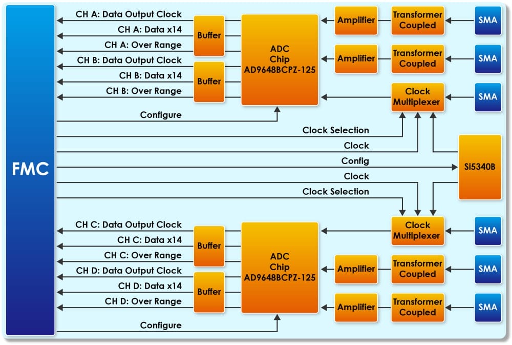 4 個高速 ADC 端口(連接到 4 個 SMA 連接器)