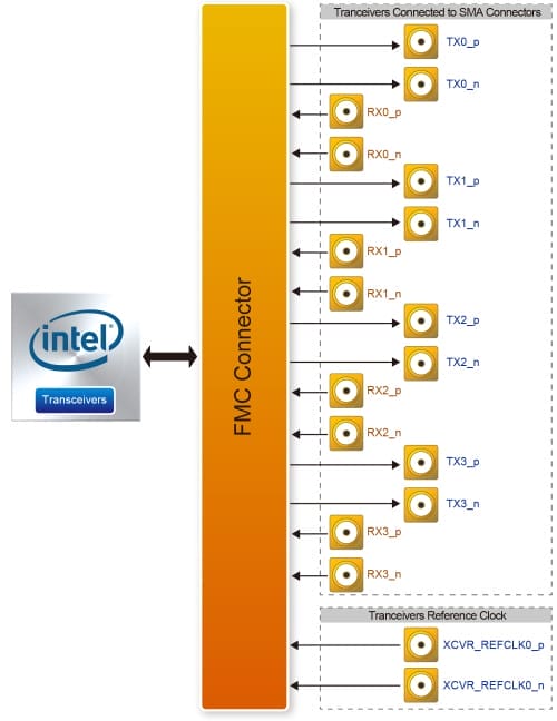 - 通過(guò) FMC 接口將 FPGA 收發(fā)器通道轉(zhuǎn)換到 SMA 連接頭