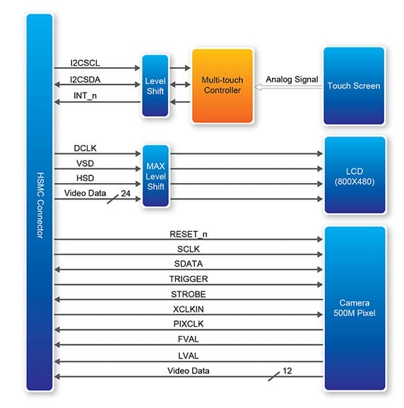 ?The Terasic Capacitive Multi-Touch LCD with Camera Module (MTLC) is not only equipped with a 7” LCD screen, it also comes with a 5-Megapixel digital image sensor module, G-sensor and light sensor. All of these sensors connect to the FPGA device via the HSMC connector and they can be controlled and used directly by the FPGA device.