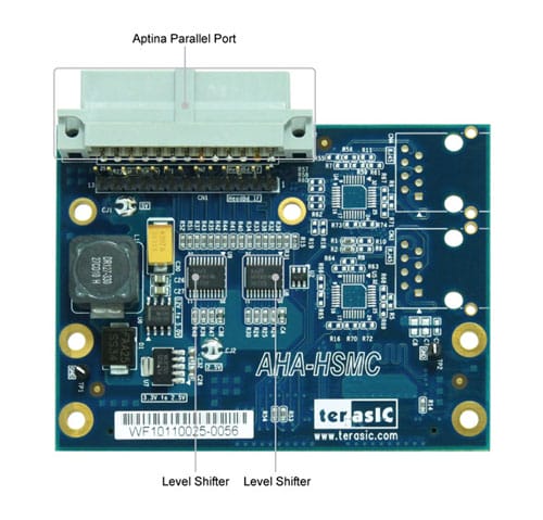 The AHA-HSMC is an interface conversion daughter card that supports Aptina’s parallel interface and Altera’s High Speed Mezzanine Connector (HSMC).