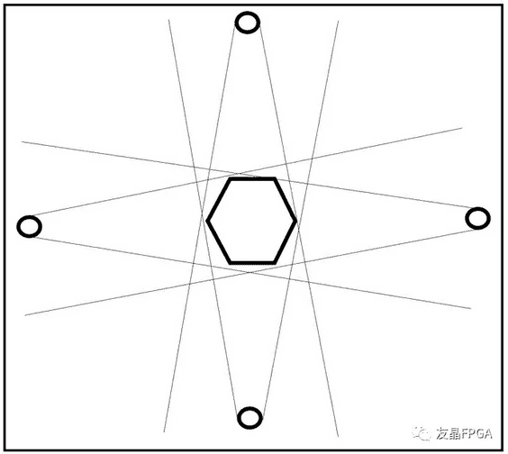 圖1.從上方俯視被攝體及攝影機(jī)擺設(shè)。六角形=被攝體,圓圈=攝影機(jī)