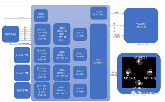 他們在工作室架設(shè)了4臺OV7670攝影機(jī),分別從四個方位,同時拍攝置于中間的物品(見圖1)。為了減少影像雜訊,工作室墻壁為黑色,攝影機(jī)也涂黑。四個鏡頭捕捉到的畫面,傳輸?shù)?/span>DE1-SoC,由FPGA做圖像處理,接著儲存于M10k記憶模塊,再經(jīng)過VGA傳到屏幕做實時顯影。
