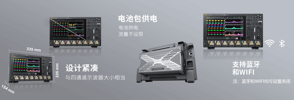 同時,DHO5000系列高分辨率數(shù)字示波器設(shè)計緊湊、體積小巧,重量僅約5.3kg,能夠節(jié)約工作臺空間,一拎即走。除此之外,DHO5000系列支持電池包供電,能夠應(yīng)對外場或車載測試場景,讓測試不再被局限。同時,DHO5000還新增了內(nèi)置的藍(lán)牙和WIFI通信模塊,支持無線網(wǎng)絡(luò)的訪問以及藍(lán)牙外設(shè)的使用,擺脫復(fù)雜的線纜。