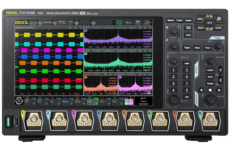 DHO5000系列高分辨率數(shù)字示波器單機8個模擬輸入通道,能夠有效應(yīng)對多通道測試需求。1GHz模擬帶寬,4GSa/s實時采樣,500 Mpts存儲深度、12 bit分辨率,足夠應(yīng)對多數(shù)嵌入式系統(tǒng)測試,并支持復(fù)雜波形的精確測試。